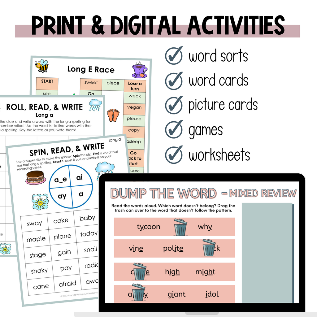 The activities include isolated practice for the most common spelling patterns and mixed reviews with all spelling patterns for each long vowel sound. Most of these activities are independent and can be used in literacy centers or for homework. The digital activities are self checking and can be done independently in centers.