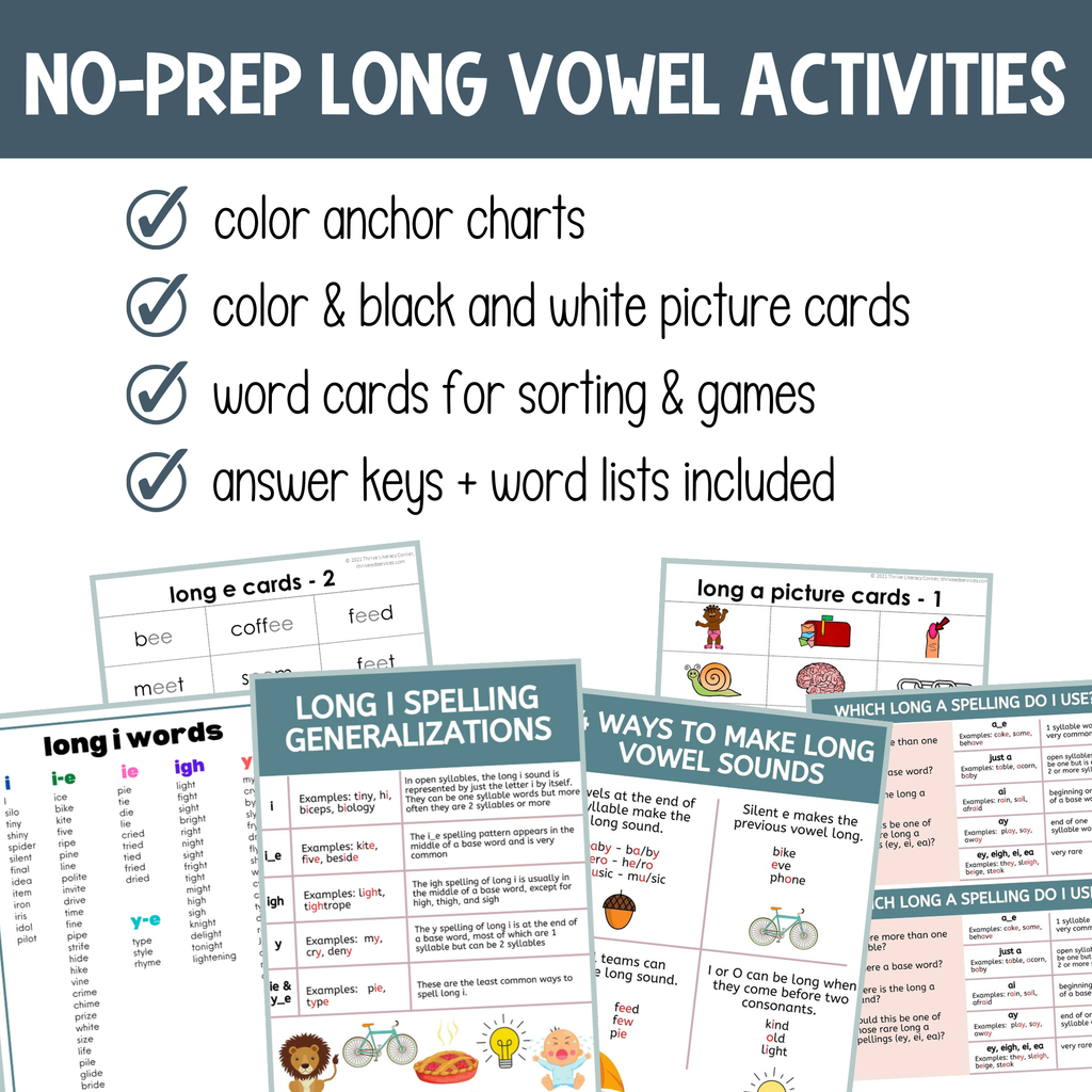 Also included are several reference sheets to help students understand the different spelling generalizations for each long vowel sound, and long vowel words master lists.