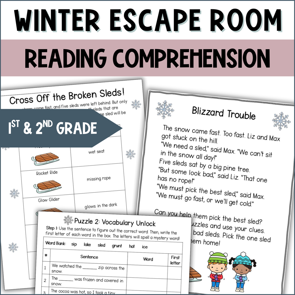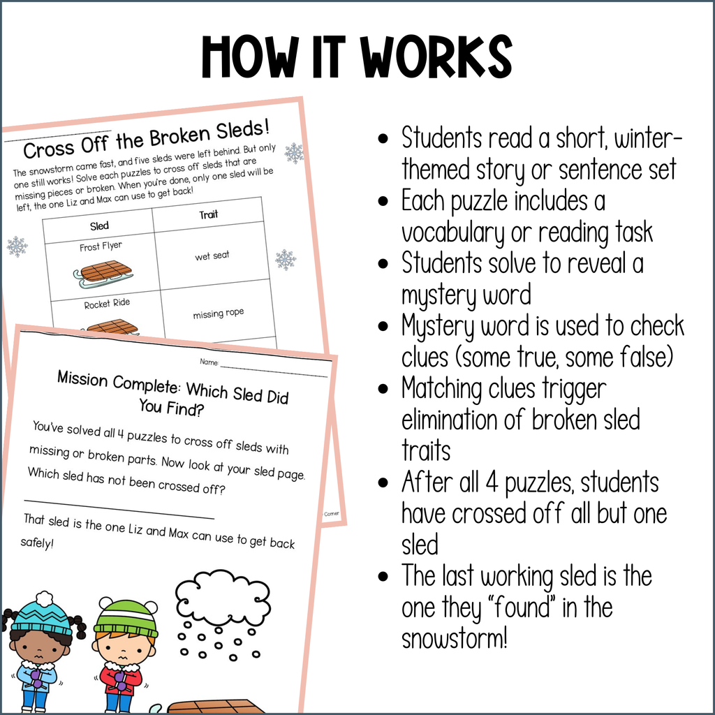 This winter reading escape challenge is a no-prep, printable phonics and comprehension activity that will have your students solving vocabulary puzzles, decoding mystery words, and eliminating clues to find the one working sled!